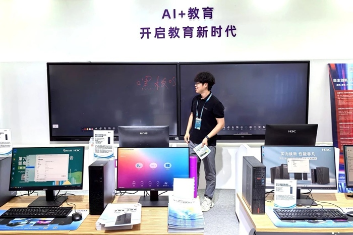 紫光計算機攜手新華三商用終端亮相本屆河教展,現場展示了跨多操作系統平臺適配的“教育+AI”解決方案。在國產化電腦上AI人工智能助手一鍵啟動,僅需輸入課程題目,電腦就能在三分鐘內撰寫一份PPT課件,引得媒體和嘉賓的廣泛關注。