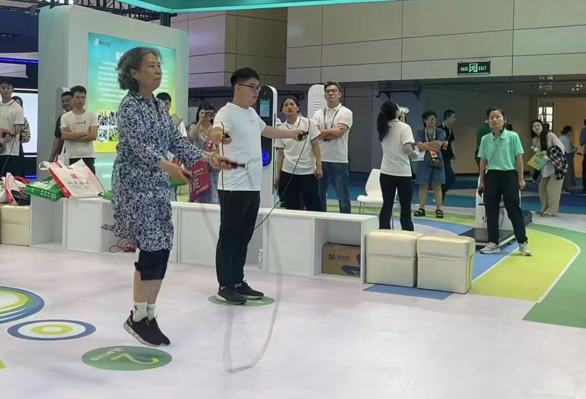 在H2-D001展位,一陣陣掌聲和喝彩聲吸引了記者的注意,原來是“新華天恒”AI智慧體育國(guó)有品牌參展商在組織智慧跳繩比賽,參賽者中甚至有一位頭發(fā)花白的老人一直嘗試單雙腳輪換跳,周圍還有不少觀眾躍躍欲試,等待體驗(yàn)的機(jī)會(huì)。