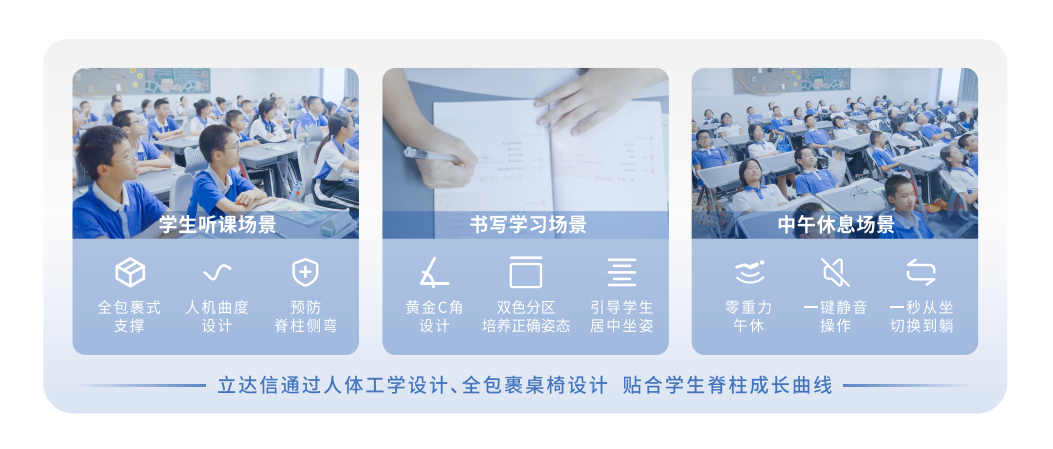 立達信護脊健康課桌椅通過人體工學設計,全包裹桌椅設計,貼合學生脊柱成長曲線。針對學生聽課場景,通過靠背、坐墊的人機曲度設計,舒緩脊柱壓力,靠背的全包裹式支撐,輔助維持坐姿中正平衡,預防脊柱側彎;針對書寫學習場景,桌面的黃金C角設計可以很好的引導學生居中坐姿,肘部弧度支撐緩解書寫疲勞,雙色分區設計,讓孩子養成正確的學習姿態,護眼又護脊;針對中午休息場景,護脊課桌椅可一鍵靜音操作,1秒從坐切換到躺,坐墊同時后仰一定角度,防止身體下滑,即使午睡也能保持好姿態,頭枕和腿托也可根據身高調節,舒適方便。