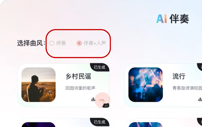 無論民謠、流行、搖滾還是國潮,AI內含多種音樂風格任你挑選!更支持同時生成多種風格伴奏,方便對比篩選,找到最契合作品的旋律!