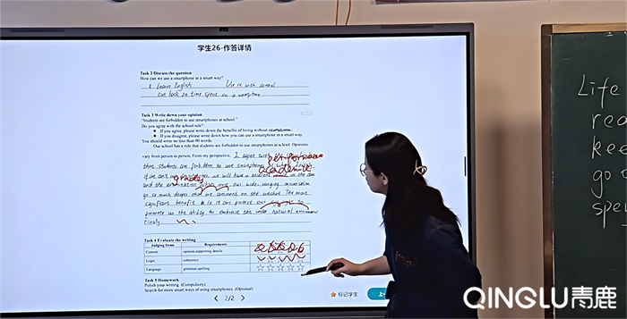 英語組的廖心怡老師在《B3U3 Extended Reading》課上,引領(lǐng)高一學(xué)生開啟高效的“英語閱讀”之旅。課堂上,學(xué)生們通過智能筆在定制的學(xué)習(xí)單上作答,廖老師巧妙運(yùn)用青鹿智慧紙筆系統(tǒng),實(shí)時查看學(xué)生答題進(jìn)度,隨機(jī)挑選典型答案,在大屏上進(jìn)行精準(zhǔn)、高效的講評。基于實(shí)時數(shù)據(jù)的互動方式,不僅極大提升了課堂的反饋效率,也讓教學(xué)重點(diǎn)更加突出。