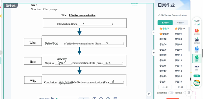 英語組張星妍老師的《XB4U2 Understanding Each Other Effective Communication》主題課也精彩紛呈。課堂上,學(xué)生們圍繞“如何實(shí)現(xiàn)有效溝通”的核心議題,展開小組討論。張老師借助青鹿智慧紙筆系統(tǒng)的分組討論功能,實(shí)時查看各小組的思維火花。對比各組的研討結(jié)論,精準(zhǔn)把握認(rèn)知差異。