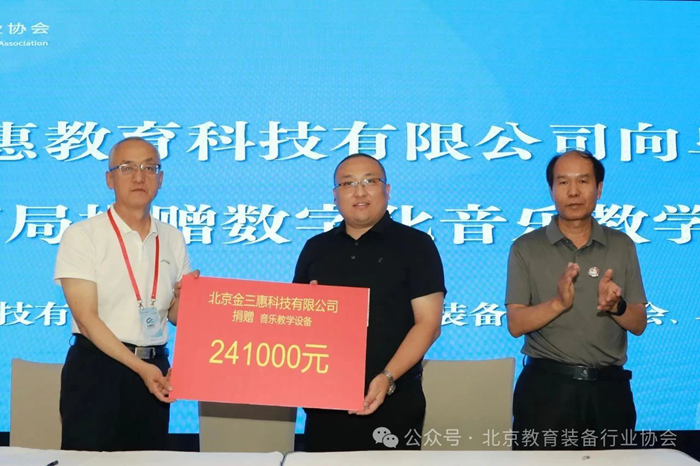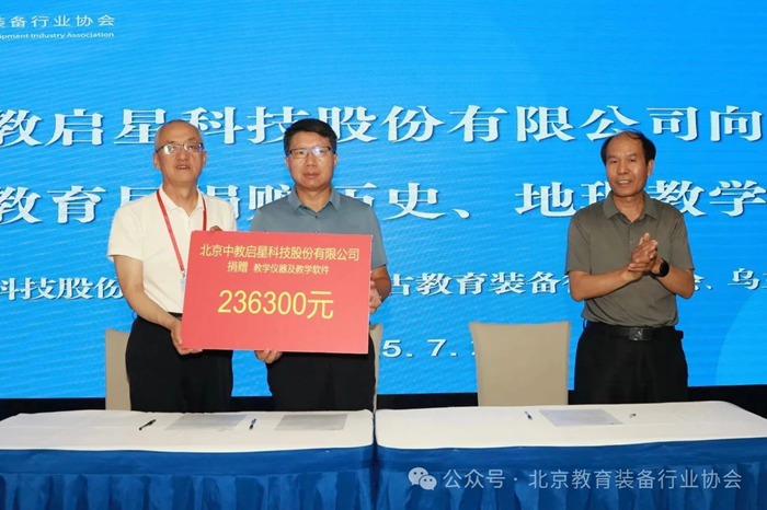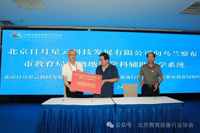 在全場嘉賓的見證下,相關代表鄭重簽署捐贈協議,定格京蒙攜手助力教育發展的重要瞬間。北京教育裝備行業協會和會員企業共計捐贈103.41萬元,其中北京教育裝備行業協會捐款 20 萬元,北京中教啟星科技股份有限公司捐贈教學儀器及教學軟件一批23.63萬元,北京金三惠科技有限公司捐贈音樂教學設備一批24.1萬元,北京日月星云科技發展有限公司捐贈中小學地理教學軟件一批35.68萬元。