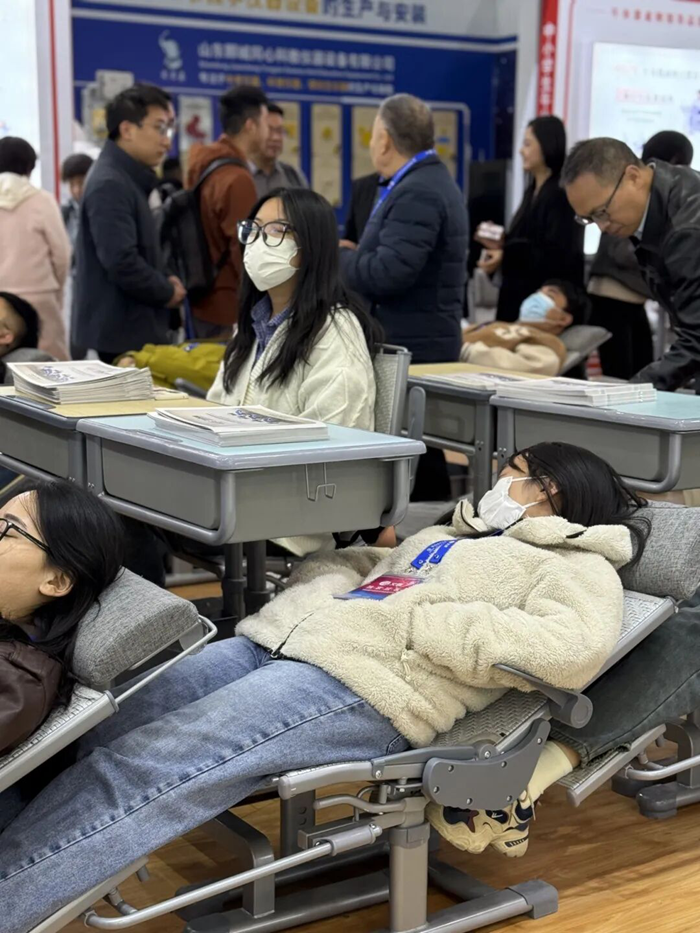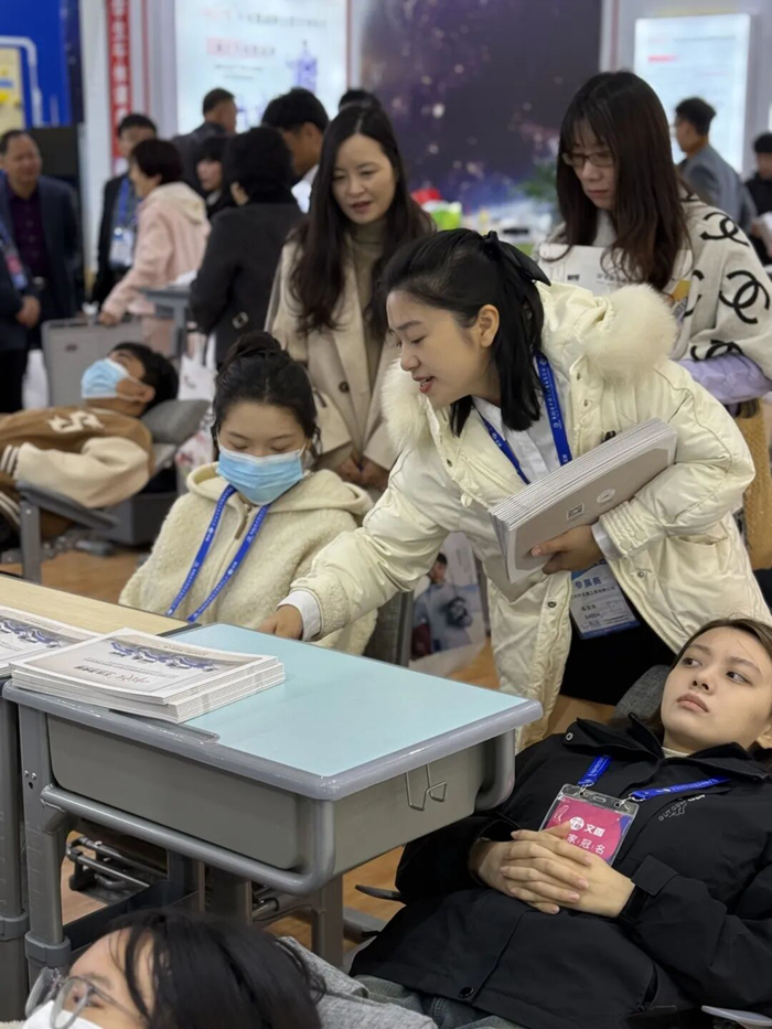 此次展會,師生之友向大家展示了符合國家標準GB/T46016-2025的優(yōu)質午休課桌椅,尤其是本次展會新品側躺式午休課桌椅受到了眾多師生朋友們的一致好評,小學排距90cm,中學排距100cm就能實現(xiàn)后仰150度午休。課椅座面采用特制的PE藤制材料編織,透氣性好,還具備良好的承托彈性,久坐不易疲勞,提升睡眠質量。工作人員以專業(yè)的技術講解以及現(xiàn)場功能展示,向各位參展商展示了產品的亮點。