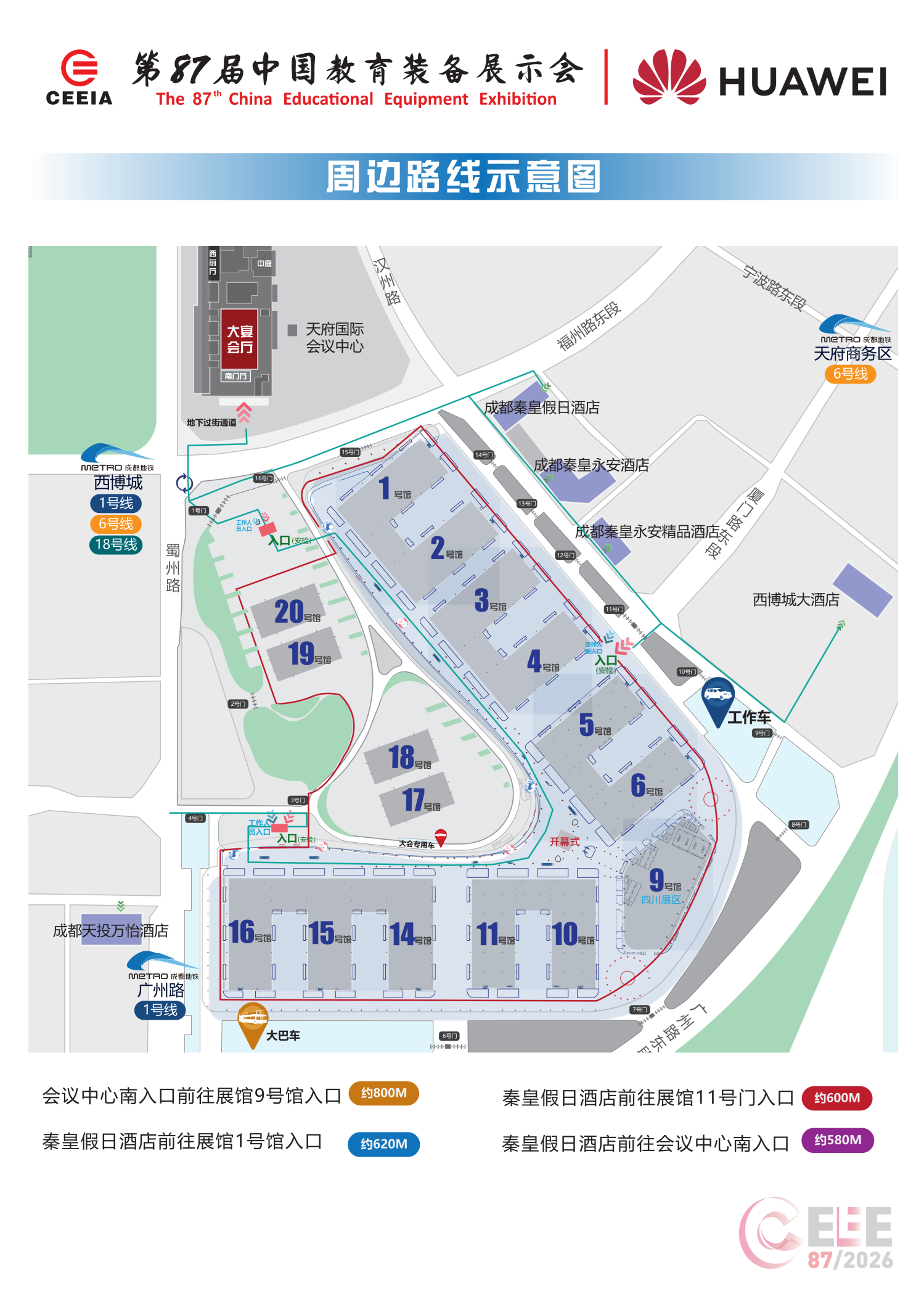 2.地鐵:天府機(jī)場地鐵站18號線→西博城站,參觀展會請從C、E口出,全程約45分鐘。