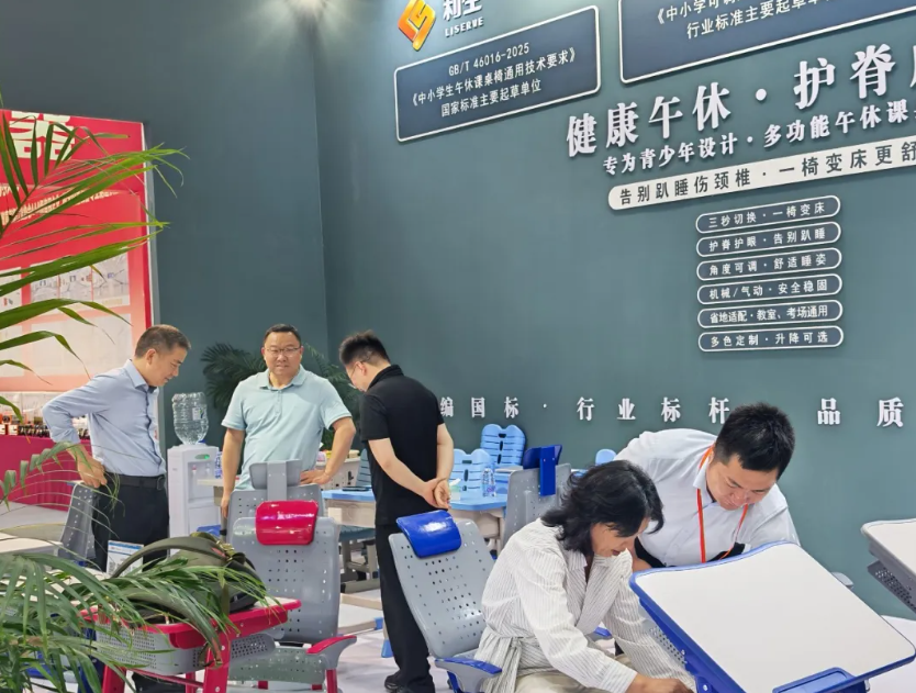 開展首日,利生科教(展位號:20號館20002) 憑借“新國標午休課桌椅”,成為現場最具人氣的打卡點之一。來自全國各地的教育工作者、采購負責人、行業專家匯聚于此,圍繞“新國標午休課桌椅”展開熱烈討論。