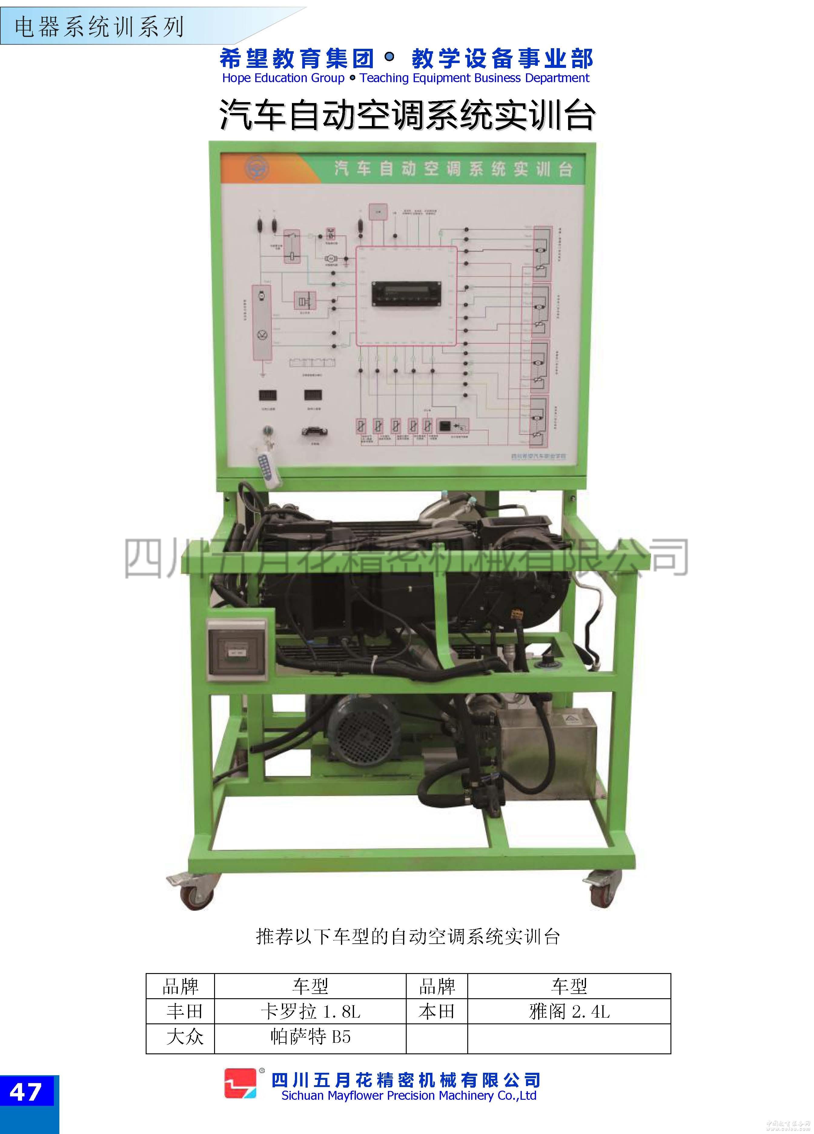 該設備采用豐田卡羅拉1.8L汽車自動空調系統為基礎,充分展示汽車自動空調系統組成結構和工作過程。適用于各類院校和培訓機構對汽車自動空調系統理論和維修實訓的教學需要。