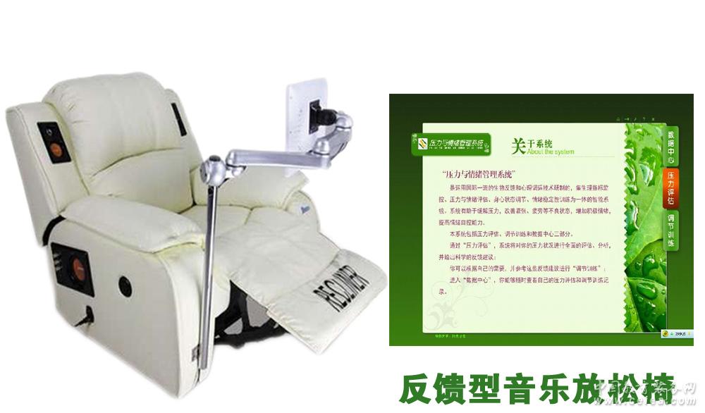產(chǎn)品詳細(xì)介紹 本款椅子帶有的系統(tǒng)采用的是HRV生理指標(biāo)采集加心理測試結(jié)合來分析評估壓力水平,有4套專業(yè)的心理健康摸底,系統(tǒng)植入了600多萬專業(yè)常模,可以比較準(zhǔn)確的生成一套反饋報告,改報告不僅從常規(guī)心理學(xué)角度來告訴我們怎么釋放壓力,還從日常飲食上也提出了放松的建議。真正的一對一對報告。里面配備了6款心理游戲,包括菩提樹開花偶像 一、【反饋型音樂放松椅】產(chǎn)品描述 1、頭等艙設(shè)計開發(fā)的進口小牛皮座椅1臺 a.產(chǎn)品尺寸:長105CM×寬90CM×高105CM(椅背收起) 長170CM×寬90CM×高60CM(椅背展開) b.產(chǎn)品重量: 凈重:45KG;最大承載量:100KG, c. 電 源: 220V(50Hz) d.獨立電動控制系統(tǒng):音樂椅靠背、腿部電動控制設(shè)計,靠背100度-180度,腿部90度-180度任意調(diào)節(jié)。 e.播音系統(tǒng):內(nèi)置日本山水高品質(zhì)音響 2、數(shù)字播放系統(tǒng):15寸觸控播放器 1個:無線遙控器,支持音樂、心理圖片、心理文章、心理電影等多種格式文件(內(nèi)置心理視聽資料含心理音樂:放松類、激揚類、冥想類、腦波共振類、抒發(fā)類、振奮類、中醫(yī)五行類、自我催眠類等類別,心理圖片:放松圖、錯覺圖,心理視頻:催眠用搖擺鐘視頻、放松訓(xùn)練教學(xué)視頻、經(jīng)典眩暈視頻、太空遐想視頻;心理電影:3部,心理小常識:txt文字版38篇) 3、音樂治療指導(dǎo)書籍 1本 4、鋁制萬向顯示器支架 1個(支持方位調(diào)節(jié),便于使用者調(diào)節(jié)顯示器角度,調(diào)整到適合自己的位置放置) 5、簡易工具包 1個 (便于顯示器及顯示器支架的安裝) 6、音樂反饋系統(tǒng) 1套