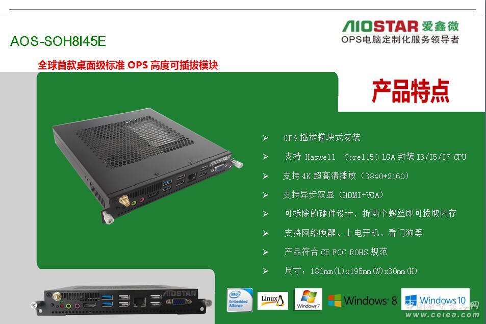 產(chǎn)品詳細介紹深圳市愛鑫微電子有限公司為更好的配合不同廠家的要求,可提供OPS主板與OPS準系統(tǒng)的方案配合各個廣告機,觸控一體機廠家,多媒體壁掛式教學(xué)一體機,數(shù)字標牌,錄播觸控一體機,同時保證所提供OPS主板與OPS插拔式電腦/OPS-C插拔式電腦主機是完全按照INTEL OPS規(guī)范定義的,完全支持鴻合教育一體機、東方中原教育一體機、創(chuàng)維教育一體機、康佳教育一體機、中銀液晶觸控一體機、中電數(shù)碼教育一體機、海爾觸控一體、TCL觸控一體機、KTC/HKC/HPC等各大交互式教育觸控一體機廠家,愛鑫微電子提供專業(yè)的定制化服務(wù)OEM/ODM. 聯(lián)系電話:18620397178 QQ:46078934 現(xiàn)階段我司已推出了一系列OPS電腦方案如下: 頂極OPS插拔式電腦方案:H110+6代CPU+2G獨立顯卡(GT730/GT850/GT950) 高端:H110+6代CPU (市場最新方案 4K極清方案)歡迎客戶取樣測試。支持4組USB3.0+3組USB2.0+3組異步顯示(VGA+HDMI+DP)+3組網(wǎng)口(可以直接接IP攝像機進行錄播與監(jiān)控或者網(wǎng)絡(luò)內(nèi)外網(wǎng)隔離進行封標) 中高端:H81+4代CPU/HM86+4-5代CPU(市場主流) 中端:H61+2-3代CPU/HM65+2-3代CPU(高性價比) 低端:baytrailJ1800/J1900無風(fēng)扇低成本的OPS電腦(幼教觸控一體機專用) 深圳市愛鑫微電子有限公司(以下簡稱“AIOSTAR”)是一家集研發(fā)、生產(chǎn)和銷售于一體的高新技術(shù)企業(yè),同時是Intel、AMD、NVIDIA等芯片廠商緊密的合作伙伴。公司主營工業(yè)主板(ITX/3.5寸/NANO等)、媒體播放主機、OPS主機、OPS可插拔式電腦模塊、OPS主板、BOX-PC、網(wǎng)絡(luò)安全硬件平臺、服務(wù)器、工業(yè)平板電腦、一體化工作站等產(chǎn)品。目前,產(chǎn)品已廣泛應(yīng)用于DS、MIDS、IWB、POS、自助查詢、零售金融、工業(yè)自動化,智能交通,網(wǎng)絡(luò)信息安全,通訊、智能安防,云計算、石油石化、醫(yī)療、軍事裝備等多個領(lǐng)域。公司高度重視客戶的需求和滿意度,針對不同的客戶需求,能夠快速做出積極的響應(yīng),為其進行量身設(shè)計并提供個性化的OEM/ODM服務(wù)。 愛鑫微電子本著以“人才是企業(yè)的財富,效益是追求的目標,發(fā)展是永恒的主題”為宗旨;以“客戶至上,品質(zhì)為尊“為原則;提倡“博愛”“齊鑫”“微天下”的意愿,愿與全球各地的企業(yè)商家攜手合作,共謀發(fā)展!