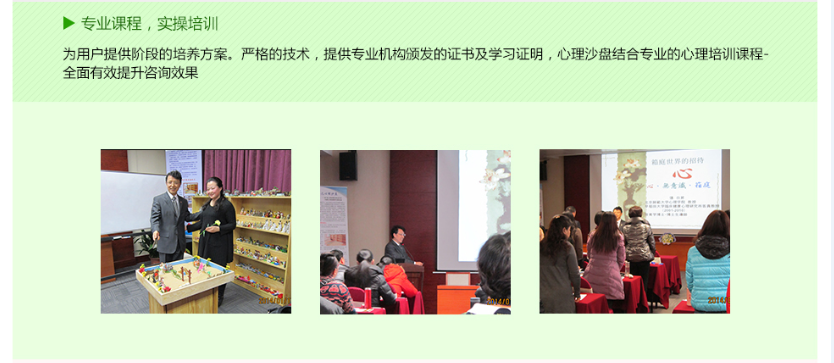 為用戶(hù)提供階段的培養(yǎng)方案,嚴(yán)格的技術(shù),提供專(zhuān)業(yè)機(jī)構(gòu)頒發(fā)的證書(shū)及學(xué)習(xí)證明,心理沙盤(pán)結(jié)合專(zhuān)業(yè)的心理培訓(xùn)課程- 全面有效提升咨詢(xún)效果。