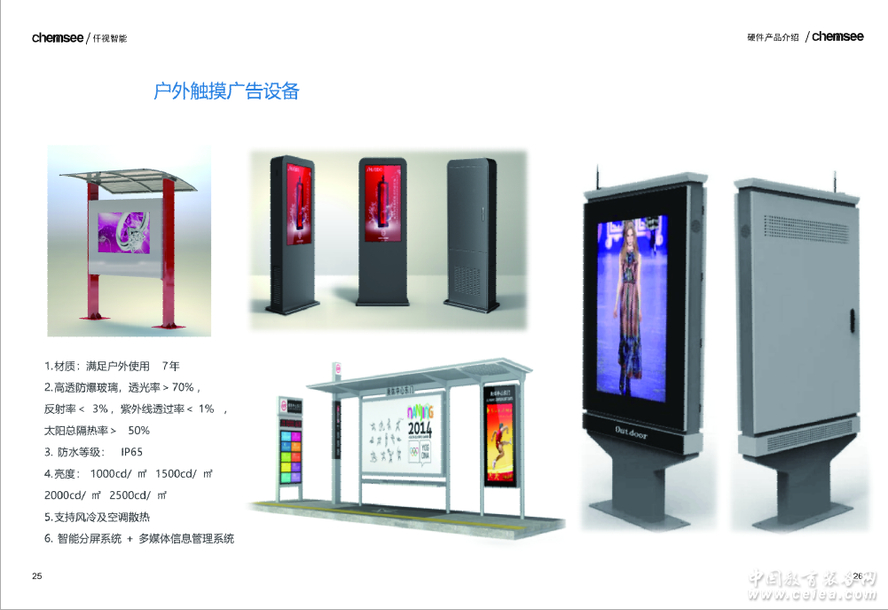產品詳細介紹產品描述: 1.整體戶外結構達到IP65防水防塵 2.設計采用多種安裝方式落地安裝或定制化安裝 3.采用高透光的玻璃,提高顯示屏的可視性,AR防眩光在陽光下得到更清晰的畫質 4.采用的鍍鋅鋼板的金屬外殼,并配合戶外防銹粉,戶外防腐達到7年 5.高亮度液晶屏,亮度達到2000cd/m2 6.采用的是LED背光源,壽命達到50000小時,環保節能 7.動態對比度高,顯示畫面更清晰 8.結合散熱方案精確控溫,顯示屏7*24小時工作亮度無衰減 9.顯示屏分辨率高達1920*1080 10.采用精密的智能空調散熱和加溫,保證內部電子元件的最佳工作環境 11.專利技術的散熱設計保證戶外55度的環境下液晶顯示屏無黑化 12.空調采用高效散熱器,環保的冷媒,制冷量更高,環保節能 13.可實現機柜內部環境(溫度 濕度 振動等)監控功能 產品性能一覽表 規格 32寸 42寸 49寸 55寸 65寸 75寸 85寸 可視角度 178°水平/178°垂直 對比度 3000:01:00 電源 AC200-240V/50HZ 整機功率 ≤200W ≤285W ≤285W ≤380W ≤500W ≤620W ≤700W 工作溫度 .-20°—45° 工作濕度 5%-90%RH 保護玻璃 AR減反射/超白/AG防眩玻璃 防水等級 IP65/IP55 電氣保護 高溫保護 漏電保護 定時開關機 C級防雷 重量-風冷款(Kg) 70 85 95 100 150 200 250 重量-空調款(Kg) 95 120 140 160 180 220 260 使用時間 80000小時 外殼工藝 鍍鋅鋼板+覆鋅底粉+表面戶外專用粉(戶外防腐達7年以上) 播放系統 電腦主板 安卓主板 遠程信息發布系統 網絡傳輸 單機 WIFI 3G 4G 觸摸屏 電容屏(10.1-55寸)納米觸摸(15-84寸) |