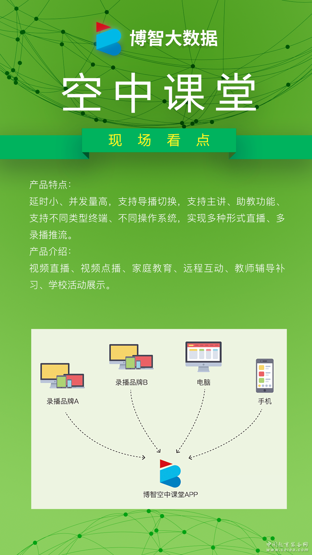 產品詳細介紹博智空中課堂通過rtmp標準協議,實現多錄播推流,支持視頻資源目錄自定義、客戶端支持局域網大規模直播無延遲、支持8錄視頻通過軟件導播切換,支持主講、助教功能。可以通過手機、電腦、攝像頭直播推流、實現多種形式直播。 產品特點: 延時小、并發量高,支持導播切換,支持主講、助教功能、支持不同類型終端、不同操作系統,實現多種形式直播、多錄播推流。