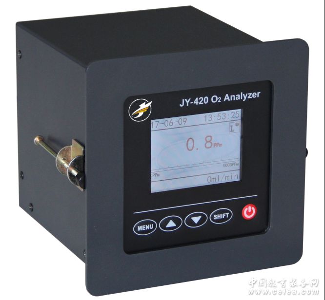 產品詳細介紹制氮機專用微量氧分析儀JY-420 技術參數: 測量原理:界限電流(離子流) 顯示方式:320×240圖形點陣彩色LCD 測量范圍:0-10/100/1000ppm O2 測量精度:0-1000ppm ≤±1% FS 0-100ppm ≤±2% FS 0-10ppm ≤±5%FS 分 辨 率:0.1ppm 重 復 性:≤±1% 響應時間:T90≤15S 模擬輸出:4~20mA.DC(非隔離輸出,負載電阻小于500歐姆) 0~10V.DC(非隔離輸出,負載電阻大于10K歐姆) 1路可編程干觸點型無源報警輸出,觸點最大容量220VAC/2A 其它接口:RS232(默認)或RS485 供電電源:AC85 ~ 264V 50/60Hz 樣氣溫度:-10 ~ +50℃ 樣氣流量:400 ~ 600ml/min(流量自動控制) 采樣方式:直通式(輸入壓力:1~ 6.5Bar) 樣氣壓力:微正壓、微負壓或正壓 背景氣體:N2、惰性氣體等混合氣體 規格尺寸:155mm×155mm×168mm(H×W×D) 開孔尺寸:135mm×135mm(H×W) 使用壽命:>4年(正常使用條件下) 氣路接口:NPT 1/8內螺紋 安裝方式:嵌入式 儀器特點: 友好人機對話菜單,操作直觀方便; 320×240圖形點陣彩色LCD顯示,顯示細膩、清晰; 傳感器具有不通電不消耗壽命,分析儀內置傳感器自動保護功能,超量程時自動進入保護狀態,延長傳感器使用壽命; 自動高精度樣氣流量控制功能,無需人為干預,氣源壓力的變化不會影響測量精度及重復性; 高精度的溫度和壓力自動補償系統,消除環境溫度及壓力對測量精度帶來的誤差; 根據用戶需要,可選配RS232(默認)或RS485數據通訊接口; 測量無須基準氣體,不受工作環境氧濃度影響; 可以和上位機進行單向或雙向通訊。 應用場合: 廣泛應用于空氣分離裝置、制氮機、保護性惰性氣體、氮氧混合氣體或氬氧混合氣體中進行微量氧濃度的準確測量。 訂貨須知(用戶訂貨時請注明) 儀器測量范圍 被測氣體壓力范圍 背景氣體只能是N2或惰性氣體 |