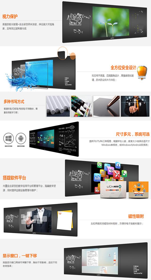 產品詳細介紹多媒體教學設備,納米智能觸控黑板,黑板一體機 1、多媒體教學設備納米智能觸控黑板是由湖南省智慧教育裝備展示體驗中心提供免費參觀體驗0731-84030580。 2、UCN納米觸控黑板,是一個集成納米觸控、高清大屏顯示、電腦主機、普通黑板、電視電腦等諸多功能于一身的多媒體教學平臺。 3、它尊重師生使用習慣,將傳統教學黑板和可感知交互的智能黑板無縫對接,既可全屏粉筆書寫,又具多媒體教學功能,操作模式簡潔;同時內置專業教學軟件、應用平臺及管理平臺,老師可靈活運用教學工具,分享調用優質教學資源,遠程管理維護升級; 4、產品尺寸:長度≥4200mm ,寬度≥1200mm ,厚度≤70mm;正面顯示由三塊拼接而成的純平面黑板,無推拉式結構,一體化設計,無任何外露連接線; 5、整個黑板平面滿足白板筆、無塵粉筆和普通粉筆書寫的功能,書寫流暢,字跡清晰; 6、產品采用超薄金屬包邊,圓角結構,安全可靠;壁掛式安裝,拆卸方便; 7、全屏開關:可在顯示區域任意位置通過五指按壓開關屏幕,方便老師操作,并且關閉屏幕的同時,觸摸功能也自動關閉,防止誤操作; 8、為了適應不同身高老師的黑板操作,可實現液晶屏顯示窗口下移,并可以進行正常使用觸摸,方便老師操作; 9、已被廣泛應用在教育教學領域,適用于各學齡段。 湖南省智慧教育裝備展示體驗中心www.ecwee.cn |