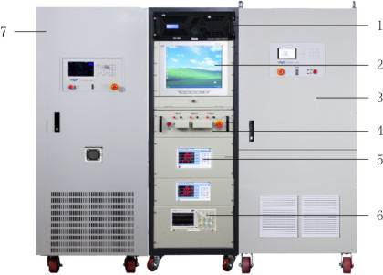 交/直流充電樁自動測試系統(tǒng)組成部分:1.工業(yè)計算機主機 2.顯示器 3. 可編程交流電源 4.系統(tǒng)控制單元 5.功率分析儀 6. 數(shù)字示波器 7.交/直流負載