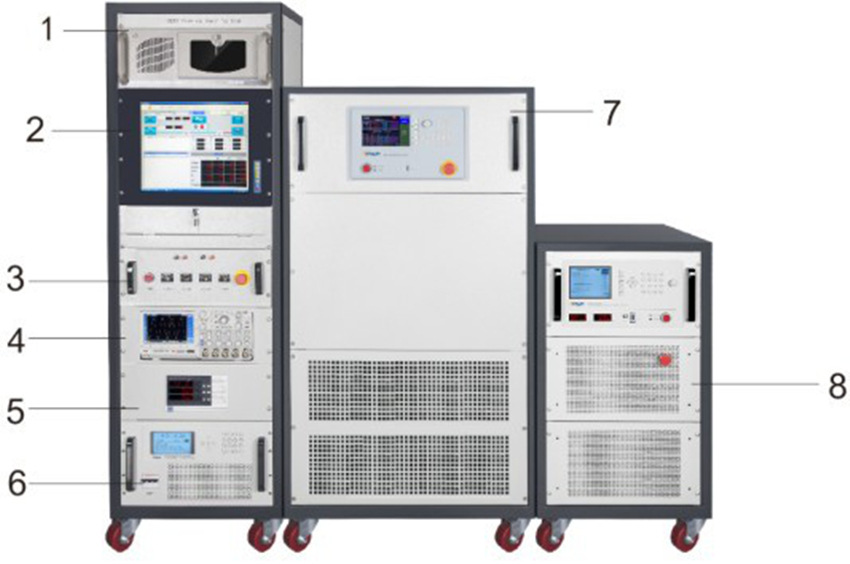 光伏逆變器自動測試系統(tǒng)組成部分:1. 工業(yè)計算機(jī)主機(jī)2.顯示器3. 系統(tǒng)控制單元4.數(shù)字示波 5.功率分析儀6. 光伏整列模擬器7.防孤島測試負(fù)載8.回饋式電網(wǎng)模擬器 測試示意圖: