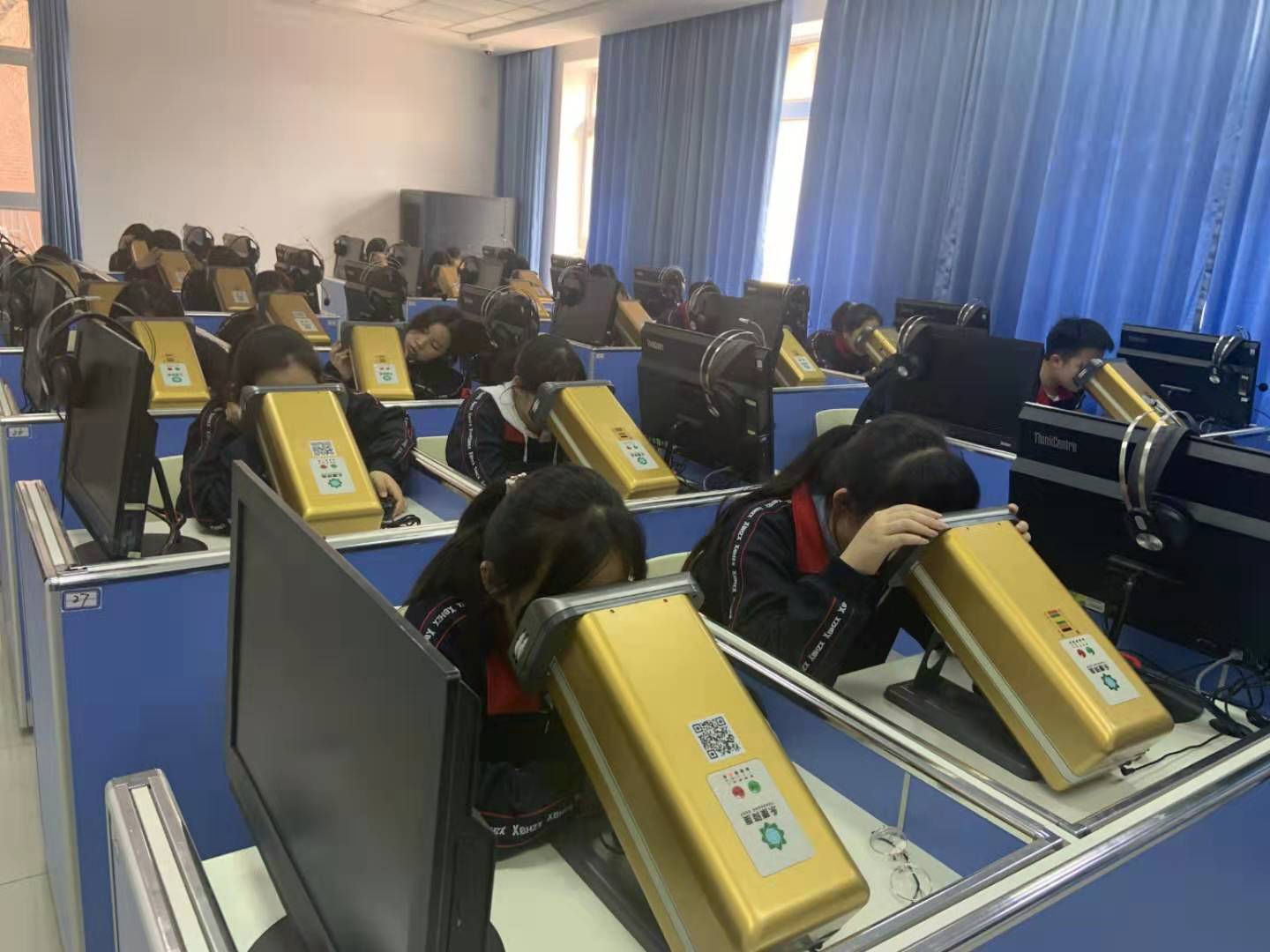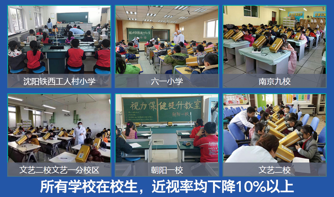學生近視防控教室,是永康視光科技集團在多項重大發明基礎上的集成創新。學校拿出一間教室,放置30-50臺永康視力提升機,學生按班級建制每周進行一次20-40分鐘的訓練,一般經過1-2個月5-10次訓練,會達到裸眼視力平均提升2行,近視率平均下降10%以上的良好效果。2018年11月、12月以及2019年1月,永康集團在沈陽市工人村第一小學、文藝二校教育集團文藝一校、朝陽一校、六一小學、南京九校等5所學校先后建立了學生近視防控教室,取得了良好效果。目前,北京市海淀區、西城區、遼寧省大連市、內蒙古烏蘭浩特市等地區,都在與永康視光集團合作,開展學生近視防控教室試點工作,并逐步在當地全面推廣。