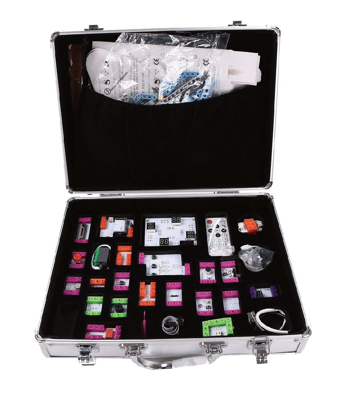 魔力百拼套裝用模塊化的電子器件拼接成各種物件。其中內置了許多編碼的彩色原件:馬達、滑動變阻器、蜂鳴器、傳感器、電池,拼接起來,就可以制造出可靠好用的電路和系統。它對電路知識的要求基本為零,不需要編程、焊接這種反復工序,通過器材的特點只需要照著已有的結構圖拼接,幾分鐘之內就可以實現自己所想。
