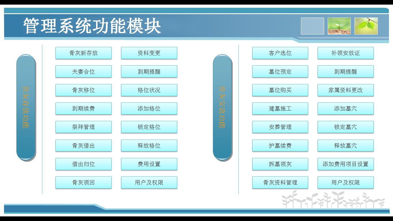 產品詳細介紹慈愿智能存放架管理系統系統由三部分組成,即電腦端的業務管理系統、手機端的家屬服務系統及智能開箱系統。軟件系統中寄存格位的設計通過利用可視化的圖形顯示,并按照實際排列順序進行編號。可對骨灰寄存進行登記、寄存架管理、寄存收費、寄存欠費、到期提醒、骨灰祭奠、骨灰帶出、骨灰返還、骨灰續存、骨灰合并、寄存變更等業務進行辦理。家屬可通過手機掃描二級碼自動開箱,可遠程祭拜和親情留言。 軟件 使用優點:便捷移動端操作,可連接微信端口,實行移動端直接實現陵園實景介紹、移動端進行業務管理、提供線上咨詢及導航等便捷功能。從而使得陵園管理更規范化、標準化、自動化、流程化。 系統功能: 寄存登記:針對需要寄存的業務進行詳細登記、選定寄存格位。打印寄存證、寄存卡功能。根據寄存時間自動產生寄存費用 寄存變更:打印新的寄存證、寄存卡;寄存撤消、續存登記、資料變更;骨灰取走:詳細記錄取走時間、委辦人等,釋放補占用的寄存格 到期提醒:管理費到期提醒、拜祭提醒、超度法會提醒,對客戶進行人性化提醒。 統計報表:統計某段時間的不同物品銷售明細,便于財務進行月底的對賬管理可以統計出某筆業務的單筆銷售明細。支持導出明細至EXCEL。 寄存位狀況查詢:以位圖的形勢反應出寄存格位的情況。不同的顏色區分當前格位的狀態。可以查看當前格位的寄存業務資料。 基礎設置:對系統數據字典進行維護,如:戶籍、死因、民族、國籍等生成數據字典,方便使用時調取。可維護系統用戶,可對不同用戶進行分組,使不同的組別成員擁有不同的權限。 自動開箱:用戶可通過指紋、密碼開箱,系統后臺對用戶手機認證綁定后,用戶通過掃描二維碼按確認即可開箱。 一卡通:在使用射頻識別門禁系統,門禁卡IC注冊為箱門的鑰匙卡,每一用戶的箱門可以設置的卡數無上限,方便家屬隨時開箱。