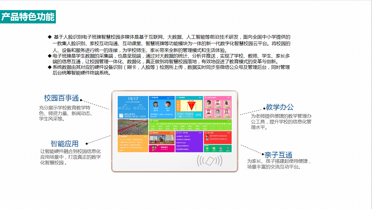 電子班牌—全方面展現師生風采 班級文化建設的載體和展示途徑 電子班牌,是智慧校園建設最重要的組成部分之一。通常在每個教室門口配置一塊22寸(或其他尺寸)高清觸控屏,可以顯示課程信息、師生資料、班級風采、榮譽展示等等內容,還可以顯示時間、天氣預報、校園通知等公共信息,另外還可以進行學生考勤、考試安排、家長消息等互動操作。智慧班牌既提升了校園的整體形象,又充分的展現了校園風采、豐富了校園生活,同時,也成了學校和班級,教師和學生,以及家長和學生之間的互動媒介之一。 |
