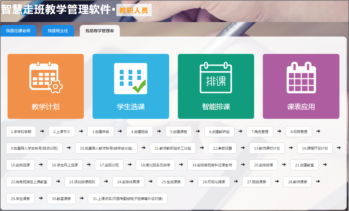 將“行政班級管理、教學班管理、功能教室、課程管理、課時規劃、開課規劃、選科管理、生涯規劃、分班管理、排課需求管理、專項課排課、行政課排課、走班課排課、上課點名、課表查詢、上課評語”等30多個小系統統一集成為一個完備的單一產品,功能完備又不失簡約;