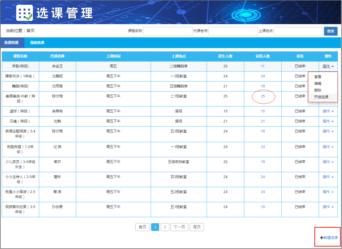 點擊“新建選課”,登記和申報拓展課課程,填寫課程名稱、代課老師、上課時間、上課地點、招生人數等信息。