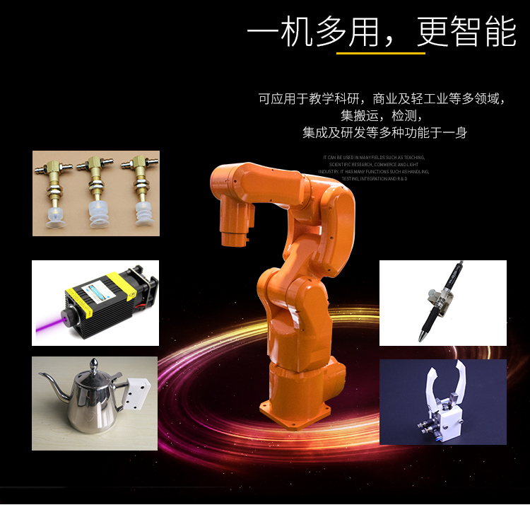 產品詳細介紹輕量化、微型化、功能全;是濃縮了企業一線制造車間用的工業機 器人所有的基本功能,真實的機器人控制系統,與 ABB/安川等品牌機器人編程語言規 則相似,提高學生編程能力�?纱钆湮瑾{服飾或寫字夾具、吸盤,用于娛樂或觀賞應用 編程學習和機器人寫字或搬運碼垛編程應用。六自由度機器人是一款針對高校教學應 用開發的六軸機器人。機器人結構緊湊、體積小、重量輕、其最大負載 5KG,臂展活動 范圍540mm。腕部采用中空結構,走線更方便、動作更靈活 |