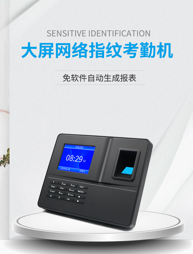 產品詳細介紹大屏網絡指紋考勤機,免軟件自動生成報表;無膜指紋采集,真人語音功能,快速識別,10萬條記錄容量,1000枚指紋容量;免軟件安裝只需三步,從此不需要將考勤機連接電腦設置,直接在考勤機上完成簡單設置,只需三步完成即可完成指紋人臉錄入,方便快捷;多種驗證,快速識別,指紋,密碼,可選ID卡,多重識別,簡單門禁功能;核心技術搞定輕松考勤;真人語音提示,讓簽到儀式感增加,正式貼心,支持多國語言,簡繁體中文、英語、西班牙、葡萄牙、韓語;可選停電打卡,斷電照打卡,機器內置電池,停電使用可持續4小時,不擔心考勤丟失;自助報表,多種方式下載,U盤下載,配置標準TCP/IP通訊協議,可聯網查看設置考勤和統計;可設置報表密碼,讓考勤數據更安全。 |