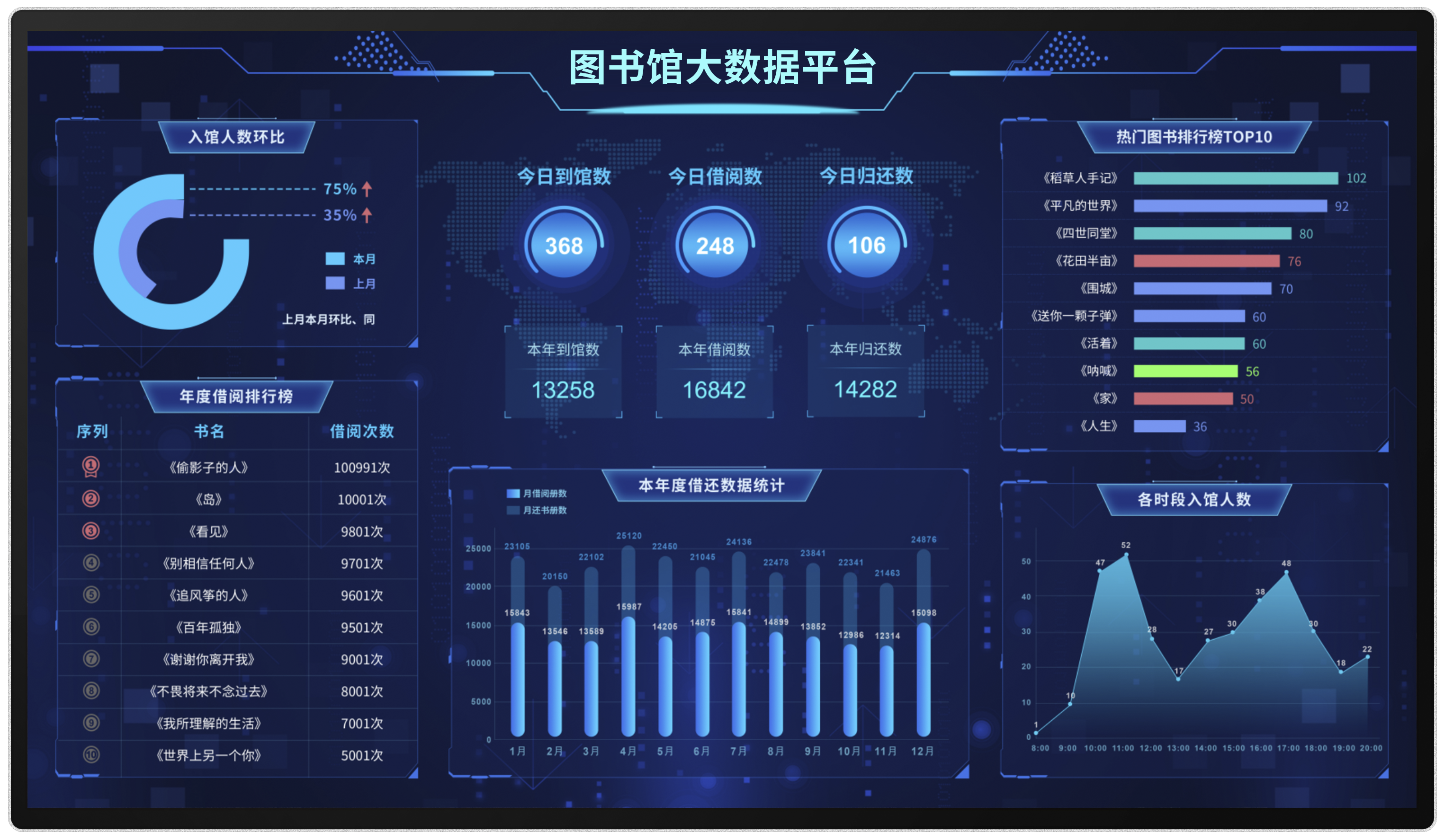 產(chǎn)品詳細(xì)介紹1、可展示圖書館的預(yù)設(shè)圖片 2、實(shí)時展示圖書館的業(yè)務(wù)數(shù)據(jù),包括日借閱人數(shù)、今日借閱量、總借閱量、今日辦證數(shù)、總辦證數(shù)、館藏總數(shù)、到館人次等常用數(shù)據(jù) (展示內(nèi)容需要可調(diào)整) 3、滾動展示圖書館所設(shè)置的公告、通知等文字信息 4、實(shí)時展示今日借閱圖書冊數(shù)線性圖 5、展示圖書館最新借閱圖書
