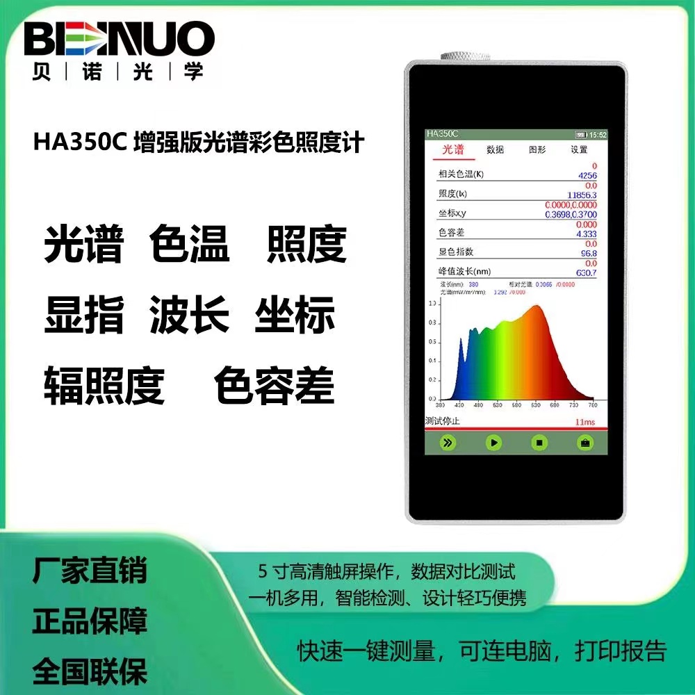 產(chǎn)品詳細(xì)介紹▲具有電子快門技術(shù),最小積分時(shí)間可以小到50us,可以測(cè)量強(qiáng)弱的光信號(hào);最大的積分時(shí)間可以更長(zhǎng),可以測(cè)到更弱的光信號(hào); ▲外觀設(shè)計(jì)更加美觀輕巧便攜(機(jī)身采用全鋁合金精密雕刻、更加超薄、分量更輕)徹底丟棄老款的磚頭機(jī); ▲系統(tǒng)的升級(jí)采用源代碼更加開放的操作系統(tǒng),更加符合智能產(chǎn)品的應(yīng)用設(shè)計(jì)為儀器后續(xù)升級(jí)提供無 限空間,放棄了老款芯片裸跑簡(jiǎn)單的界面系統(tǒng); ▲采用5.1寸高清IPS電容觸屏,高顯示分辨率,一屏顯示更多內(nèi)容,色彩鮮艷圖形顯示更加逼真,觸摸及使用更加流暢,界面設(shè)計(jì)更加合理,體驗(yàn)更強(qiáng); ▲快速開關(guān)機(jī),一鍵測(cè)試,更加便捷的使用,大電池容量,24小時(shí)超長(zhǎng)的測(cè)試使用時(shí)間。 B、功能描述: ● 光譜分布圖 ● 相關(guān)色溫 Tc(K)、黑體偏離Duv ● 光照度 E(lx) 燭光E(Fc) 輻射照度 Ee(W/m²) ● 色品坐標(biāo)(x,y)、(u,v)、(u′,v′) ● 相對(duì)光譜功率分布 P(λ) ● 顯色指數(shù) Ra,Ri(i=1~15) ● 顯色指數(shù) (長(zhǎng)條示意圖) ● 顯色指數(shù) (空間示意圖) ● 色品坐標(biāo)圖CIE1976 CIE1960 CIE1931 ● 色容差圖 SDCM(麥克亞當(dāng)橢圓、矩形框以及 CIEu’v’圓) ● 主波長(zhǎng)、峰值波長(zhǎng)、中心波長(zhǎng)、質(zhì)心波長(zhǎng)、半寬度 ● 明暗視覺比S/P ● 色純度、紅色比、綠色比、藍(lán)色比,CIE1931三基色刺激值 X、Y、Z ● 可導(dǎo)出每納米的光譜數(shù)據(jù) ● 更多功能參數(shù)可定制 |