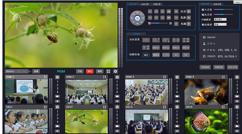 大屏輸出 通過 HDMI 接口輸出 PGM 合成通道的全屏視頻顯示,支持單畫面、多畫面分割顯示 1/2/3/4 分屏顯示。可預設分屏模式位置圖像大小功能。 界面輸出 支持硬件 HDMI 接口輸出系統操控界面,方便本地實時操控。