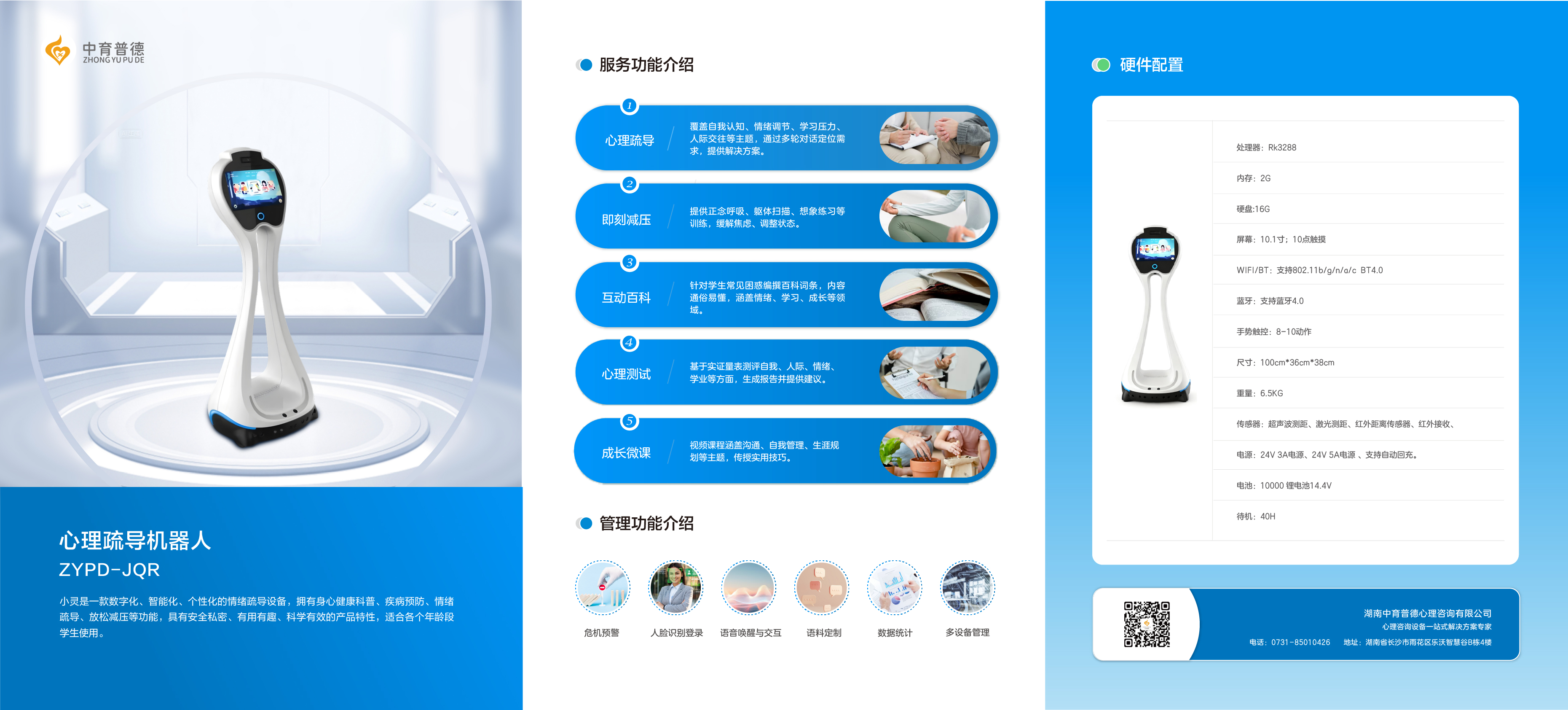 產(chǎn)品詳細(xì)介紹【核心目標(biāo)】 排解負(fù)面情緒,傳授調(diào)節(jié)方法,科普心理健康知識,引導(dǎo)學(xué)生從煩惱困惑中走出來。旨提供專業(yè)便捷的心理健康自助服務(wù),幫助學(xué)校解決遇到成長煩惱和存在輕微心理問題的學(xué)生,只需聯(lián)電聯(lián)網(wǎng)即可24小時待命維護(hù)學(xué)生的心理健康。 【能給學(xué)校帶來哪些幫助】 1.心理科普、放松訓(xùn)練、學(xué)生輕微心理困惑等,需要心理老師付出大量時間和精力反復(fù)操作的事情,可以全部交由小靈完成。 2.作為心理老師的搭檔和助手。簡化工作流程,減輕工作負(fù)擔(dān)。讓老師從繁雜的工作中抽身出來,專注于非機(jī)器所能解決的問題。 【服務(wù)功能】 1.心理疏導(dǎo) 涵蓋認(rèn)識自我、親子溝通、調(diào)節(jié)情緒、快樂學(xué)習(xí)、同伴交往、適應(yīng)生活、師生關(guān)系等模塊。學(xué)生與小靈聊天地過程中提出困惑問題即可定位需求,匹配對話方案,在聊天的過程中排解負(fù)面情緒,傳授解決問題的知識與方法并提供專業(yè)的心理調(diào)節(jié)方法和技巧。支持同個心理主題多輪次對話,類似心理輔導(dǎo)流程。 2.即刻減壓 涵蓋多種減壓放松訓(xùn)練,包括正念呼吸、軀體掃描、想象練習(xí)、腹式呼吸等,放松訓(xùn)練。用于心理減壓,緩解考前焦慮,調(diào)整個人狀態(tài)。 3.互動百科 涵蓋自我與他人、學(xué)習(xí)技巧、能力培養(yǎng)、趣味心理、情緒、成長等問題。根據(jù)學(xué)生常見的煩惱與困惑進(jìn)行百科詞條選題,結(jié)合學(xué)生認(rèn)知發(fā)展水平編創(chuàng),內(nèi)容通俗易懂。 4.心理測試 涵蓋自我、人際、情緒、學(xué)業(yè)四個板塊。幫助學(xué)生認(rèn)識自己,所用量表均有實(shí)證研究和文獻(xiàn)支持,數(shù)據(jù)可靠。心理報告不僅有測評結(jié)果描述,還有針對測評結(jié)果的建議,以及對應(yīng)的解決方法。 5.成長微課 涵蓋溝通方法、成長課堂、自我管理、科學(xué)學(xué)習(xí)、生涯規(guī)劃等課程。普及情緒調(diào)節(jié)和自我管理等方法。 【管理功能】 1.危機(jī)預(yù)警 聊天中評估學(xué)生的心理危機(jī)水平,發(fā)現(xiàn)預(yù)警高風(fēng)險個體,第一時間通知管理員,報告學(xué)生面臨的風(fēng)險問題類型,以便及時危機(jī)干預(yù);管理端可查看用戶預(yù)警對話記錄。 2.人臉識別:支持人臉識別登錄,身份識別。 3.語音喚醒:支持語音喚醒,可定制喚醒詞。 4.語音交互:該機(jī)器人可通過語音指令操作,實(shí)現(xiàn)行走,打開頁面等功能。 5.語料定制:支持語料定制服務(wù),根據(jù)單位的特殊需要,定制對話語料。 6.數(shù)據(jù)統(tǒng)計:統(tǒng)計本單位所有用戶使用數(shù)據(jù),形成數(shù)據(jù)報表。支持單位與人員管理。 7.設(shè)備管理:管理本單位多臺設(shè)備,支持多臺設(shè)備數(shù)據(jù)互聯(lián)。 |