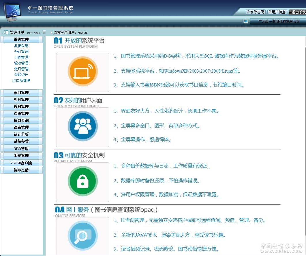 產品詳細介紹 卓一圖書館管理系統是一套非常專業且通俗易懂的圖書館信息化管理系統,也是國內一套圖書館趨勢化的應用系統,并朝著RFID智能自助圖書館的方向發展。它符合國家教育部頒布的“校園信息管理平臺標準”的純B/S結構的圖書管理軟件,特別針對各類型圖書館的管理需求而設計的管理軟件,是圖書館科學化、信息化、數字化建設的最有力工具。它實現了圖書館數據采集、編目管理、借閱流通、數據統計、圖書檢索、圖書預借、個人信息查閱等一系列相關圖書館的操作。它充分發揮了信息化管理的方便性,快捷性,并與一卡通無縫結合,讓圖書館管理人員高效地工作。 -------------------------------------------------------------------------------- 產品特點 1、圖書管理系統采用純B/S架構,采用大型SQL 數據庫作為數據庫服務器平臺。 2、支持多系統平臺,如WindowsXP/2003/2007/2008/Liunx等。 3、支持輸入書籍ISBN碼就可以獲取書目信息,節約編目時間。