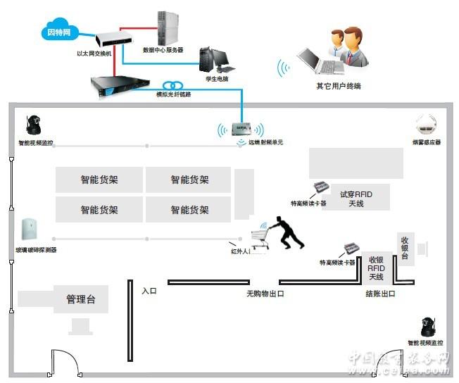 通過整體RFID、無線傳感器網(wǎng)絡(luò)、WiFi等物聯(lián)網(wǎng)綜合技術(shù),加以配備必要的賣場設(shè)施設(shè)備布置,實(shí)現(xiàn)人流量檢測、商品識讀和動態(tài)監(jiān)控、動態(tài)盤點(diǎn)、補(bǔ)貨提醒、智能上架、智能揀貨、電子價簽制作、商品信息推送、購物引導(dǎo)、試穿體驗(yàn)統(tǒng)計(jì)、環(huán)境監(jiān)控、自動結(jié)算、商品追溯查詢等智慧超市應(yīng)用。