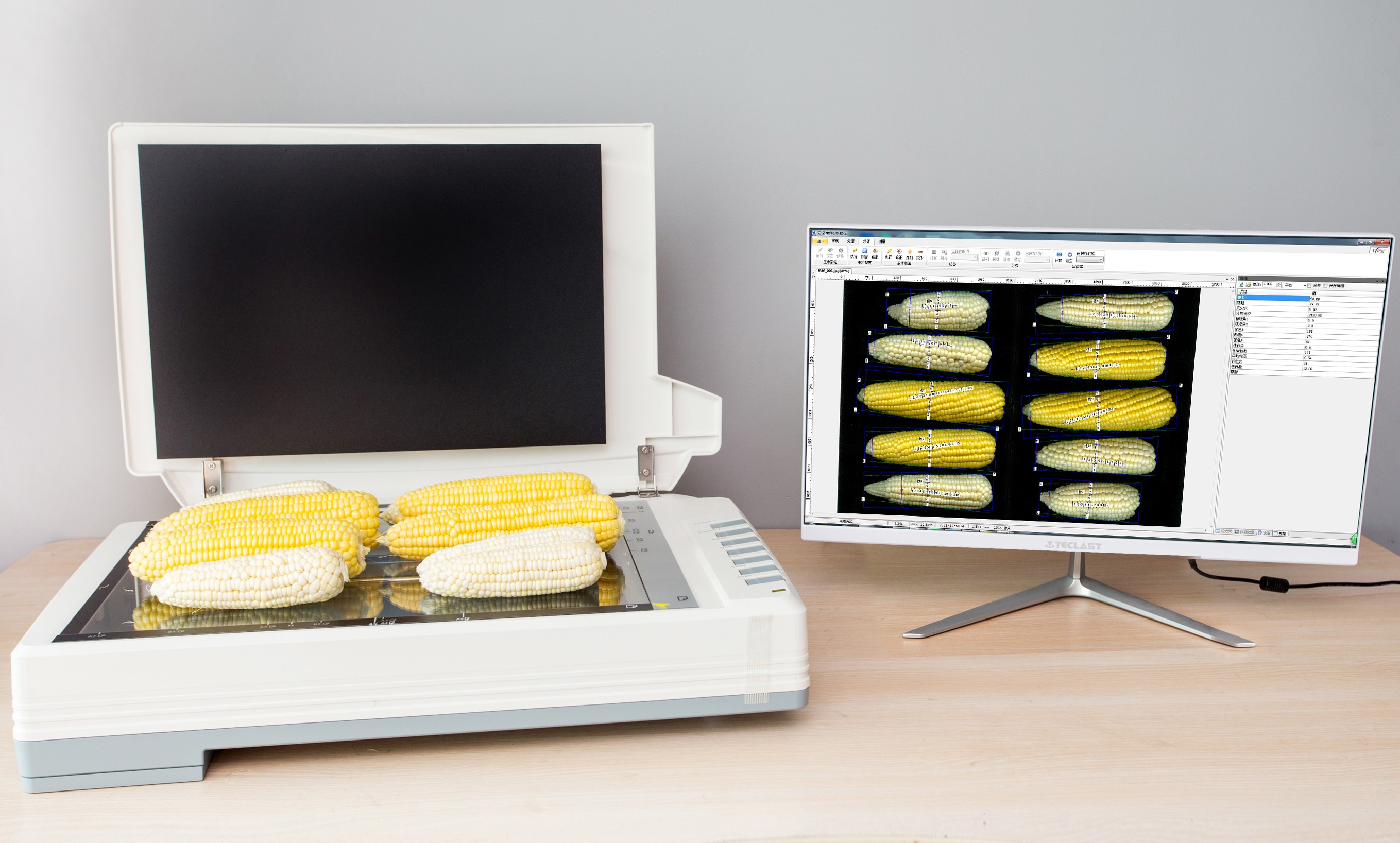 產(chǎn)品詳細(xì)介紹SC-G型自動(dòng)考種及千粒重分析儀(含玉米果穗考種) 貨物名稱(chēng):SC-G型自動(dòng)考種及千粒重分析儀(含玉米果穗考種) 玉米自動(dòng)考種及千粒重分析儀 所配的各種種粒自動(dòng)考種及千粒重分析儀 一、用途 用于各類(lèi)農(nóng)作物實(shí)粒種子(谷粒、玉米、小麥、油菜籽等)的精確考種,各類(lèi)糧庫(kù)的蟲(chóng)口計(jì)數(shù)分析。可兼做表面光滑的昆蟲(chóng)計(jì)數(shù)或蟲(chóng)卵計(jì)數(shù)(如:米象、蚜蟲(chóng)、蠶卵、魚(yú)籽等),以及被當(dāng)作種子凈度工作臺(tái)用于種子凈度檢驗(yàn)。 二、主要技術(shù)指標(biāo) 1、配最高分辨率1600dpi × 1600dpi紫光M1彩色掃描儀,掃描分析區(qū)為A3幅面431.8mm×304.8 mm。可同時(shí)成像分析除黑玉米和雜色花玉米以外的10個(gè)玉米果穗、35個(gè)玉米截面、1000粒左右玉米籽粒。 2、配大景深的500萬(wàn)像素彩色拍攝儀及A3幅面超薄背光燈板,具有相機(jī)畫(huà)面畸變、背光板均勻性的自動(dòng)矯正特性,有效減小尺寸測(cè)量誤差。 3、籽粒考種分析: (1)可分析各類(lèi)種粒的直徑1.0~20mm。玉米籽粒自動(dòng)數(shù)粒速度1500~3000粒/分鐘,對(duì)于直徑較小的種粒(如油菜籽、蔬菜籽)單批次考種數(shù)量5000~10000粒/分鐘,其它籽粒為1200~20000粒/分鐘,數(shù)粒誤差≤±0.1~0.4%,監(jiān)視修正即達(dá)100%正確。自動(dòng)千粒重分析的精度誤差≤±0.5%。 (2)★具有自學(xué)習(xí)和增強(qiáng)學(xué)習(xí)種粒顏色、形狀自動(dòng)分類(lèi)的特性,能實(shí)現(xiàn)品種差異比對(duì)的特性,及具有按英國(guó)皇家園林協(xié)會(huì)RHS比色卡的比色特性來(lái)分析種粒顏色。 (3)★可根據(jù)實(shí)際需求自行創(chuàng)制一鍵自動(dòng)分析向?qū)В勺詣?dòng)精確考種水稻、小麥、玉米、豆類(lèi)、油菜籽、瓜子、蔬菜籽等各類(lèi)農(nóng)作物籽粒。 (4)★能大批量自動(dòng)分析成像后的種粒圖片,自動(dòng)測(cè)出籽粒數(shù)、各籽粒的粒形參數(shù)(長(zhǎng)、寬、長(zhǎng)寬比、面積、等效直徑、周長(zhǎng)等),以及其平均值,能精準(zhǔn)顯示種粒外接矩形,可自動(dòng)排序輸出,及可輸出粒徑分布圖表。 4、★玉米果穗、截面考種分析: (1)同時(shí)成像分析玉米果穗10個(gè)/次/分鐘、玉米截面35個(gè)/次/分鐘。 (2)全自動(dòng)測(cè)出各玉米穗長(zhǎng)、穗粗、禿尖長(zhǎng)、左右穗緣角、穗行角、平均行粒數(shù)、粒厚、截面穗行數(shù)、穗粗、軸粗,以及其平均值,可自動(dòng)測(cè)出各玉米截面上的平均粒長(zhǎng)、平均粒寬等參數(shù)。 5、分析過(guò)程為全程電腦控制,高效、準(zhǔn)確、簡(jiǎn)便易用,真正一鍵式操作,鼠標(biāo)一點(diǎn),結(jié)果即現(xiàn)。具有被測(cè)樣本條碼、電子天平RS232重量數(shù)據(jù)的自動(dòng)輸入接口。 6、可用鼠標(biāo)選擇增加/刪除,或直接用鼠標(biāo)在屏上手工計(jì)數(shù),以確保100%正確目標(biāo)區(qū)的個(gè)性化計(jì)數(shù),也可對(duì)工作區(qū)視野中任選范圍或矩形范圍內(nèi)的計(jì)數(shù)。 7、分析圖像結(jié)果可保存,能自動(dòng)形成總報(bào)表,統(tǒng)計(jì)分析結(jié)果可輸出保存至Excel表。 以及按寬度、長(zhǎng)度、面積等輸出的排列圖和測(cè)量圖。 8、儀器有云平臺(tái)支持,可將分析數(shù)據(jù)保存到云端隨時(shí)隨地查看。