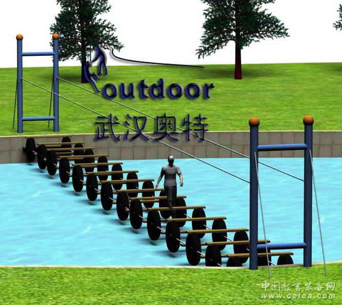 拓展器材產(chǎn)品介紹:水面上由輪胎與木板搭建的上下起伏的趣味橋。