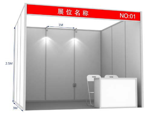 每個標準展臺包含:咨詢桌1張(H750X500X100),折椅2把,電源1處 500W,射燈2盞。